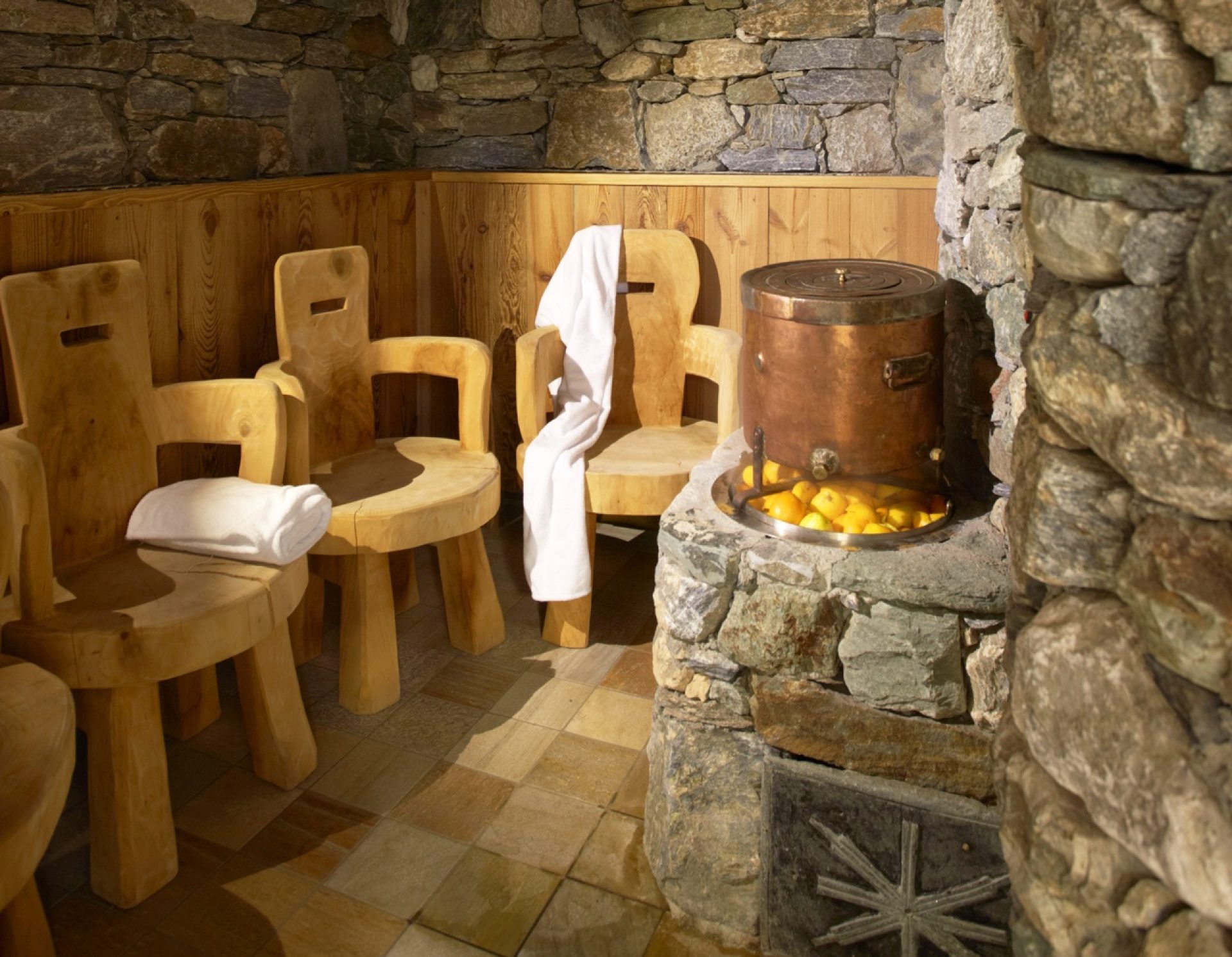 Il calore si avvicina ai 60°C in un ambiente saturo di vapori di fieno alpino contenuto in una gerla. La grotta è rivestita di pietre impreziosite da innumerevoli inclusioni di cristalli di quarzo grigio del Monte Bianco.