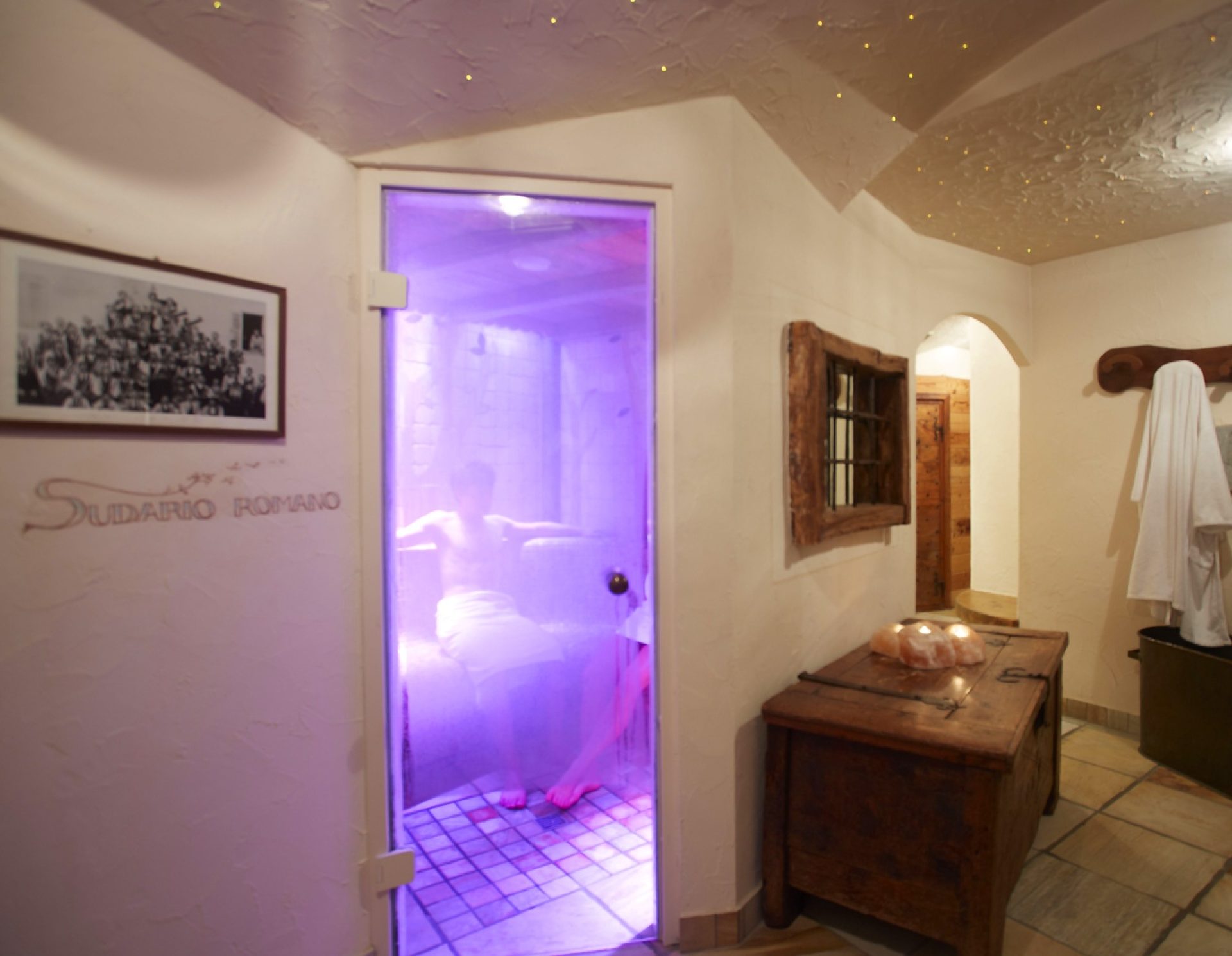 Questa suggestiva sauna, profumata in modo naturale al pino mugo e caratterizzata da acqua, fuoco e calde pietre naturali, porta benefici alle vie respiratorie e al sistema immunitario.